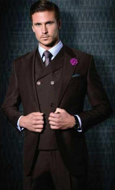 Mens Walking Suit 1 Button Peak Lapel Side Vents Double Breasted Suit Vest Wide Leg Pants Comfort Fit Three Piece Suit Color: Burgundy SKU#JA7976
