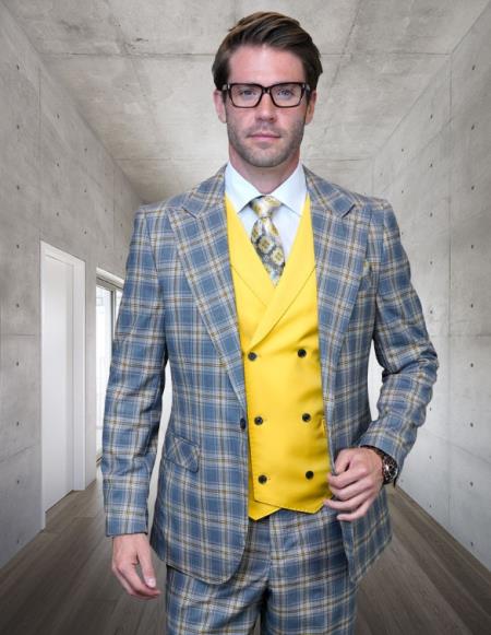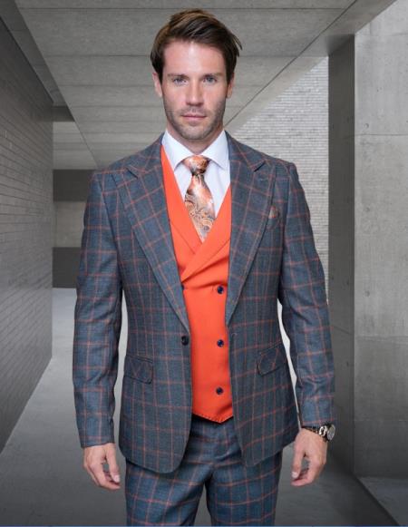 View full details1 Button Peak Lapel Single Breasted Modern Fit Double Breasted Vest Windowpane Pattern One Chest Pocket Two Flap Front Pocket Color: Grey