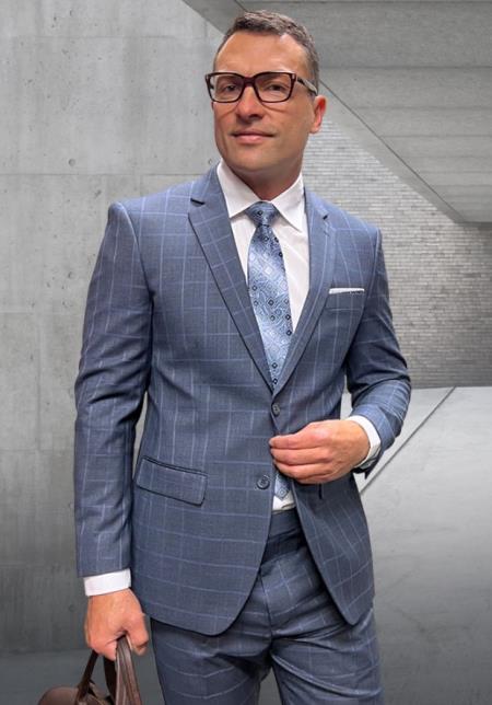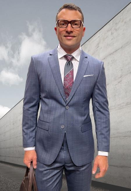 2 Button Notch Lapel Single Breasted Windowpane Pattern Modern Fit Flat Front Pants Besom Chest Pocket Two Flap Front Pocket Color: Grey