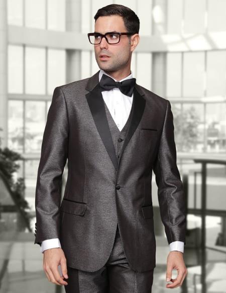 1 Button Shawl Lapel Single Breasted Flat Front Pants Matching Bow-Tie One Chest Pocket Two Besom Pocket Color: Grey