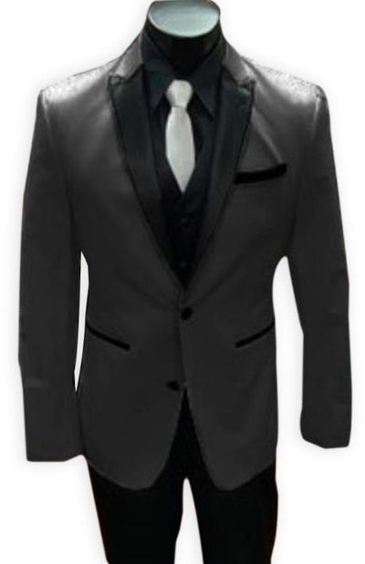 View full detailsTwo Button Self Lapel with Thin Satin Trim Satin Trimmed Flap Pockets Side Vents Color: Steel Grey Mens Grey And Black Tuxedo Wedding - Charcoal Gr...