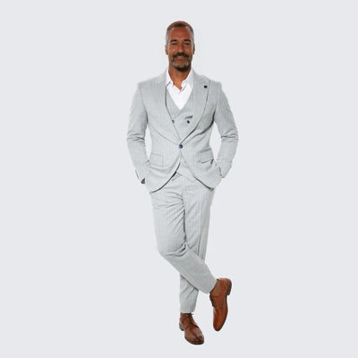 View full detailsStep into timeless elegance with this men’s 3-piece light grey pinstripe suit, tailored for a sophisticated and modern look. Made from premium-qual...