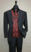Mens Three Piece Suit - Vested Suit Mens Black/Red Jacket With Bold Vest with matching Tie and Hankie