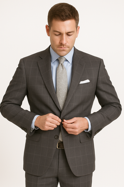 View full detailsThe Men’s Grey Two Button Plaid Windowpane Suit with Flat Front Pants in a Regular Cut is a perfect example of timeless style combined with afforda...