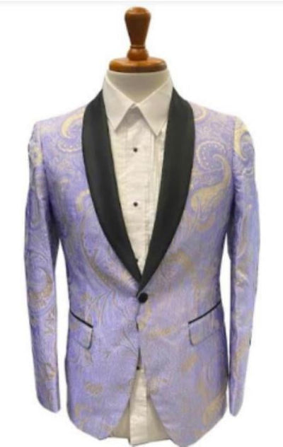 View full detailsRed And Gold Tuxedo Dinner Jacket - Prom Blazer 1 Button Shawl Lapel Single Breasted One Chest Pocket Two Flap Front Pockets Color: Lavender and Gold