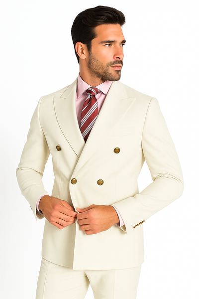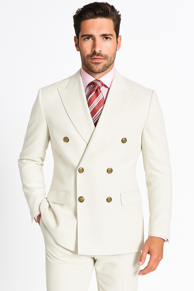 6 Button Double Breasted Peak Lapel Ticket Pocket One Chest Pocket Two Flap Front Pocket Color: Ivory SKU#JA54072