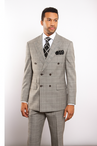 Double Breasted Suit Button Closure Peak Lapel One Chest Pocket Flap Front Pockets Ticket Pocket Plaid ~ Windowpane Can be Blazer or Sport Coat Pat...