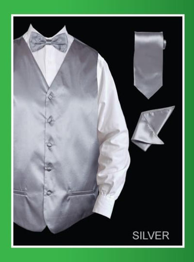 Men's 4 Piece Vest set (Bow Tie, Neck Tie, Hankie)- Satin Silver The mesmerizing style of this delightful vest set melts your heart Intricatel...