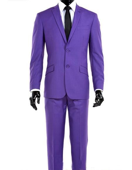 2 Button Notch Lapel One Chest Pocket Flap Front Pockets 5 Piece Side Vents Flat Front Pants No Pleats Material: Poly/Rayon Color: Purple SKU#JA53995
