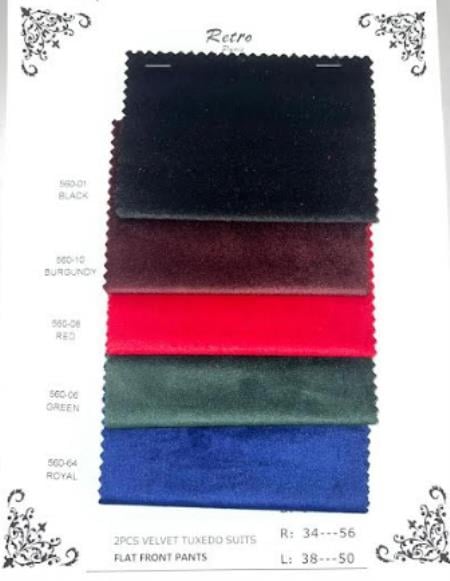 2PC Velvet Tuxedo Suits Flat Front Pants Color: Black,Burgundy,Red,Green and Royal SKU#JA57385