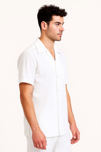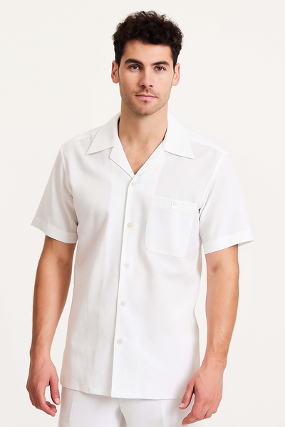 Buttons Closure One Chest Pocket Short Sleeve with collar Short Pant with side pockets Mens Linen Suit Color : White SKU#CH696