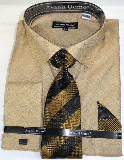 Men's French Cuff Dress Shirt Shimmering Shark-Skin Fabric Cuff links Floral pattern Tie Color: Tan SKU#JA4180