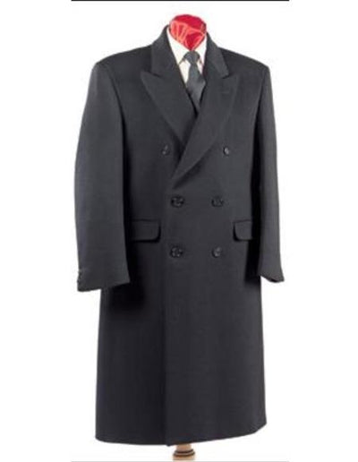 Top Coat, Full Length Overcoat Double Breasted 6 on 3 Buttons, 50" Length with Tabs on Sleeves Color: Black