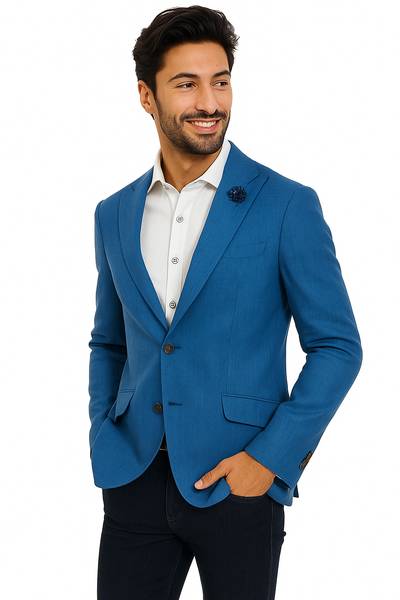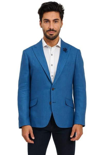 View full detailsTwo Button Peak Lapel One Chest Pocket Two Flap Front Pockets Color: Blue Mens Linen Suit SKU#JA1725