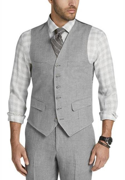 View full detailsSingle Breasted 5 Button Vest V-neckline Adjustable Back Belt Besom Front Pockets Flat Front Pants Material: 100% Linen Color: Light Gray