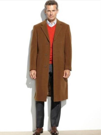 Mens Topcoat 3 Buttons Closure Solid Pattern 48 Inch Long Notch Lapel One Chest Pocket Patch Front Pockets Material: Cashmere Color: Light Brown