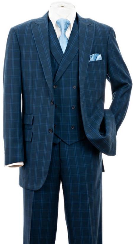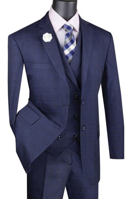 2 Button Notch Lapel One Chest Pocket Flap Front Pockets Slim Fit Flat Front Pants Plaid ~ Windowpane Pattern Color: Navy SKU#JA54232