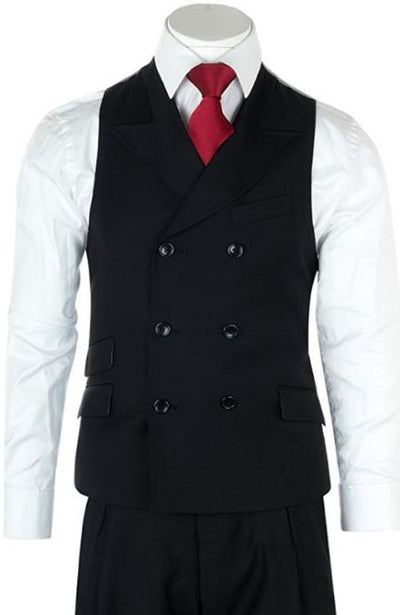 Six Button Double Breasted Peak Lapel One Chest Pocket Two Flap Front Pockets Ticket Pocket Color: Black Wool SKU#JA1951