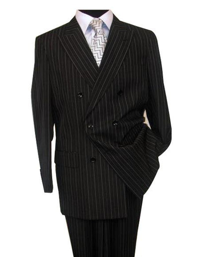 View full detailsDouble Breasted Button Closure Peak Lapel One Chest Pocket Flap Front Pockets Stripe Pattern Material: Super 120'S Wool Color: Black SKU#GD1655
