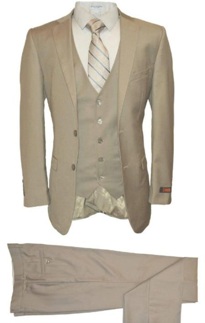 2 Button Notch Lapel Single Breasted Modern Fit Suits Double Vented One Chest Pocket Two Flap Front Pockets Color: Tan SKU#JA56337