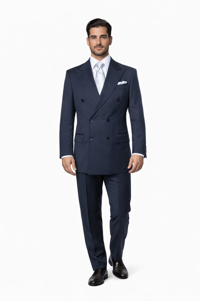 Classic Fit Pleated Pants Peak Lapel With Double Breasted Vest 100% Wool Suit Color: Solid Navy