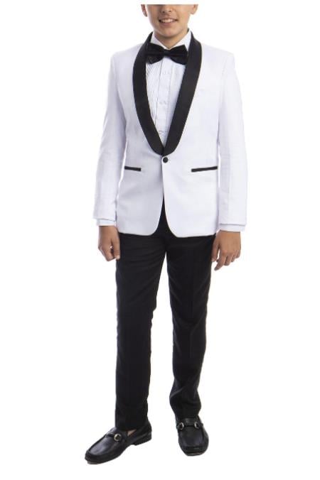 One Button Single Breasted Shawl Label Two Flat Front Pockets One Chest Pocket Color: White SKU#JA1255