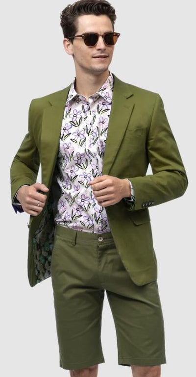 1 Button Single Breasted Peak Lapel Ticket Pocket One Chest Pocket Two Flap Front Pockets Color: Olive Green SKU#JA53907