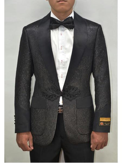 One Button Shawl Lapel Shiny Pattern One Chest Pocket Patch Two Pockets Color: Black ~ Black SKU#JA726