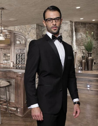 1 Button Peak Lapel Single Breasted Besom Chest Pocket Two Besom Pocket Color: Black