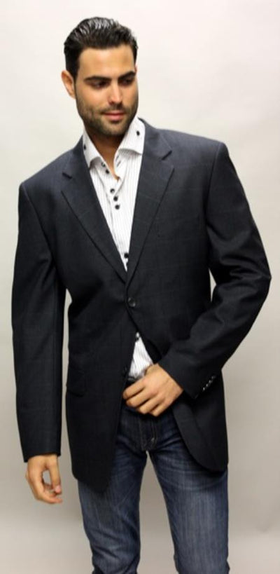 2 Button Notch Lapel Single Breasted Windowpane Pattern Modern Fit Flat Front Pants Besom Chest Pocket Two Flap Front Pocket Color: Navy