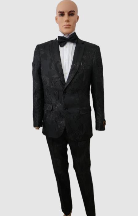 Two Button Single Breasted Notch Lapel One Chest Pocket Two Flap Front Pockets Floral Pattern Matching Bowtie Color: Black SKU#JA8007