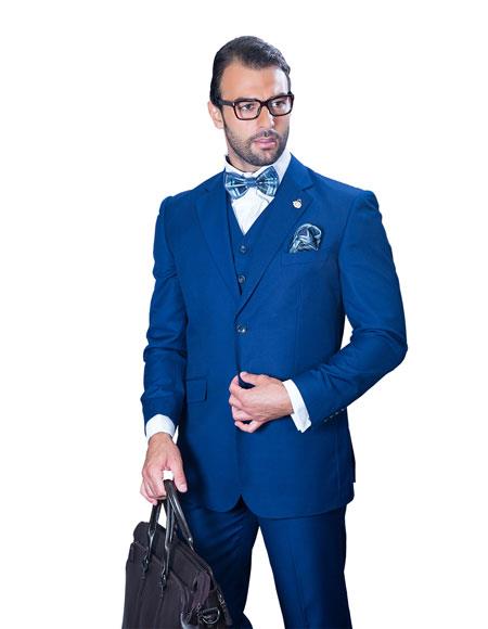 2 Button Notch Lapel Single Breasted Double-vented Flat Front Pants One Chest Pocket Two Flap Front Pocket Color: Sapphire