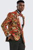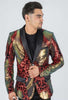 View full detailsTwo Button Single Breasted Peak Lapel One Chest Pocket Flap Front Pockets Floral Pattern Color: Red ~ Gold SKU#JA1519