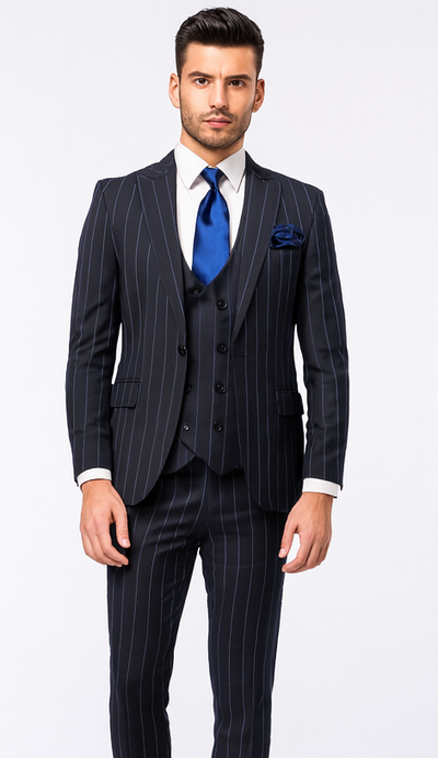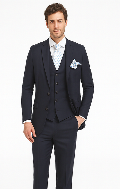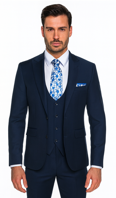 View full detailsThe Rossi Man MAX RM1725 Slim Fit 3-Piece Suit in Navy is a modern masterpiece that combines classic tailoring with contemporary elegance. Crafted ...