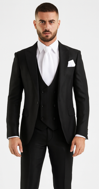 View full detailsThe Rossi Man MAX RM1712 Slim Fit 3-Piece Suit in Black is a timeless formalwear essential, crafted for men who value sophistication, style, and ve...