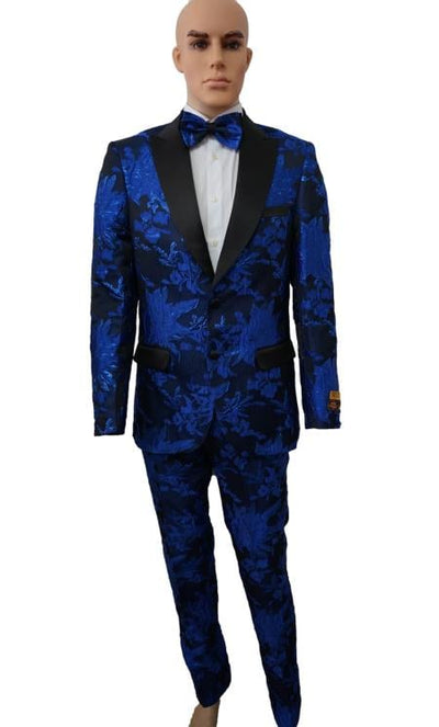 2 Buttons Single Breasted Peak Lapel One Chest Pocket Two Flap Front Pockets Paisley Pattern Color: Royal Blue SKU#JA5170