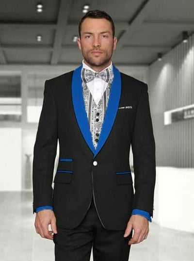 Slim Fit, Peak Lapel Tuxedo and Two Toned Lapel English Style With Black Pants Color: Royal Blue SKU#RT1456