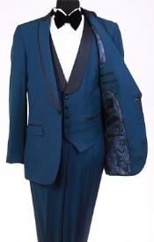 View full detailsBryan Michaels Tuxedo Luxury Polyester 65% Viscose 35% One Button Shawl collar Flat Front Trousers Lapeled Vest Color: Royal Blue SKU#RM1112