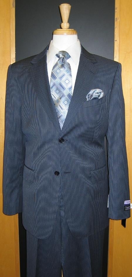 Modern fit 2 piece includes a blazer and pants Single breasted 2 buttons Side vents Flat front pants, un-hemmed bottoms for alteration ease Stripe...