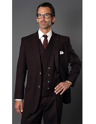 Giorgio Fiorelli Suit Two Buttons Notch Lapel Besom Chest Pocket Front Flap Pockets Striped Pattern Modern Fit Double Vent Flat Front Pants Materia...