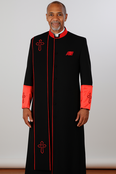 8 Button Closure Mandarin Collar Full Church Robe Two Toned Suit Cross Accents Material: Poly/Rayon Color: Black/Red SKU#SM3696