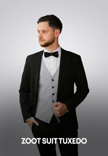 View full detailsThis black one-button tuxedo is crafted from luxurious Super 140βs virgin wool sourced from Milan, Italy, offering both comfort and refined structu...