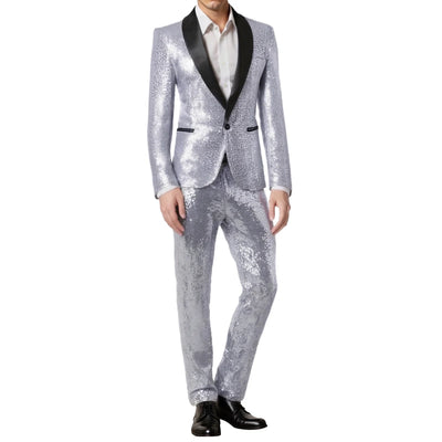 View full detailsSilver sequin mens tuxedo suit designed for bold style and standout formal elegance. This silver suit features a full sequin finish with a contrast...