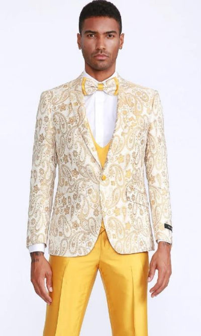View full detailsYellow Tuxedo Black and Gold Floral Pattern Blazer | Formal Jacket - Prom Dinner Jacket + Black Pants + Bowtie - Make a bold and luxurious impress...