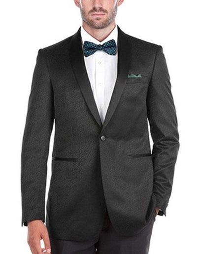 View full detailsMetallic Lame Stone Color Black Satin Shawl Lapel Slim Fit One Button Closure Side Vets Colorful Paisley Lining Color: Black