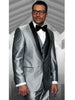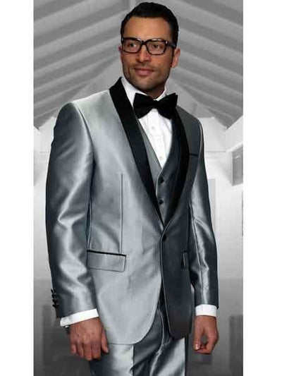 3 Piece Vested Suit Single Breasted 1 Button Tuxedo Side Vent Flat Front Pockets Modern Fit Shawl Lapel Color: Silver SKU#SM1146