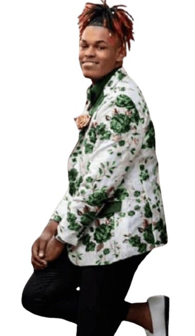 Button Closure Single Breasted Paisley or Floral Pattern One Chest Pocket Two Flap Front Pockets Color: White and Hunter Green