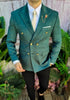 6 Button Peak Lapel Double Breasted Slim Fit One Chest Pocket Two Flap Front Pockets Color: Green