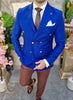 6 Button Peak Lapel Double Breasted Slim Fit One Chest Pocket Two Flap Front Pockets Color: Deep Blue