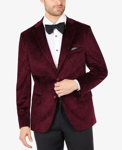 2 Button Notch Lapel Single Breasted Slim Fit Paisley Pattern One Chest Pocket Two Flap Front Pocket Color: Maroon